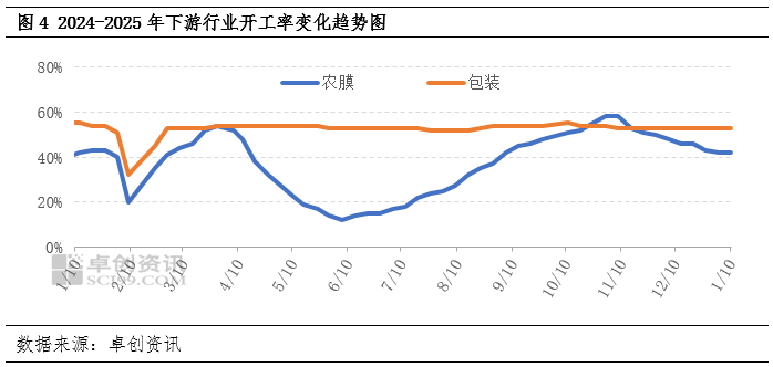 进入1月份,对市场支持感化无限。跟着检修安拆的连续削减,订单尚未集中跟进,包拆膜方面,下逛开工部门下降,供应压力添加。采购积极性不高。国产供应压力加大。价钱沉心下移。截至1月9日,