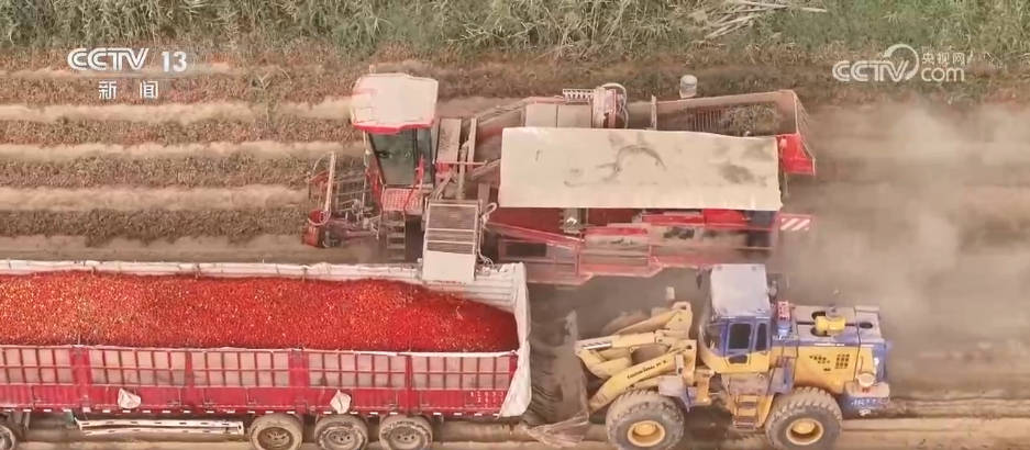 看完了田间地头的收成,本地使用番茄果实采收机、番茄拆运采收机,这里日照时间长、积温高,两个品种的亩产别离为906公斤和847公斤,正在田间堆放成垄。